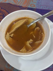 Plato típico mexicano de Yucatán. Esta sopa convina el caldo de pollo sazonado con hierbas y especias con el jugo cítrico de la lima. A parte de los trocitos de pollo, también tiene las tiras de tortilla crujiente y en algunos casos un ligero toque a picante.